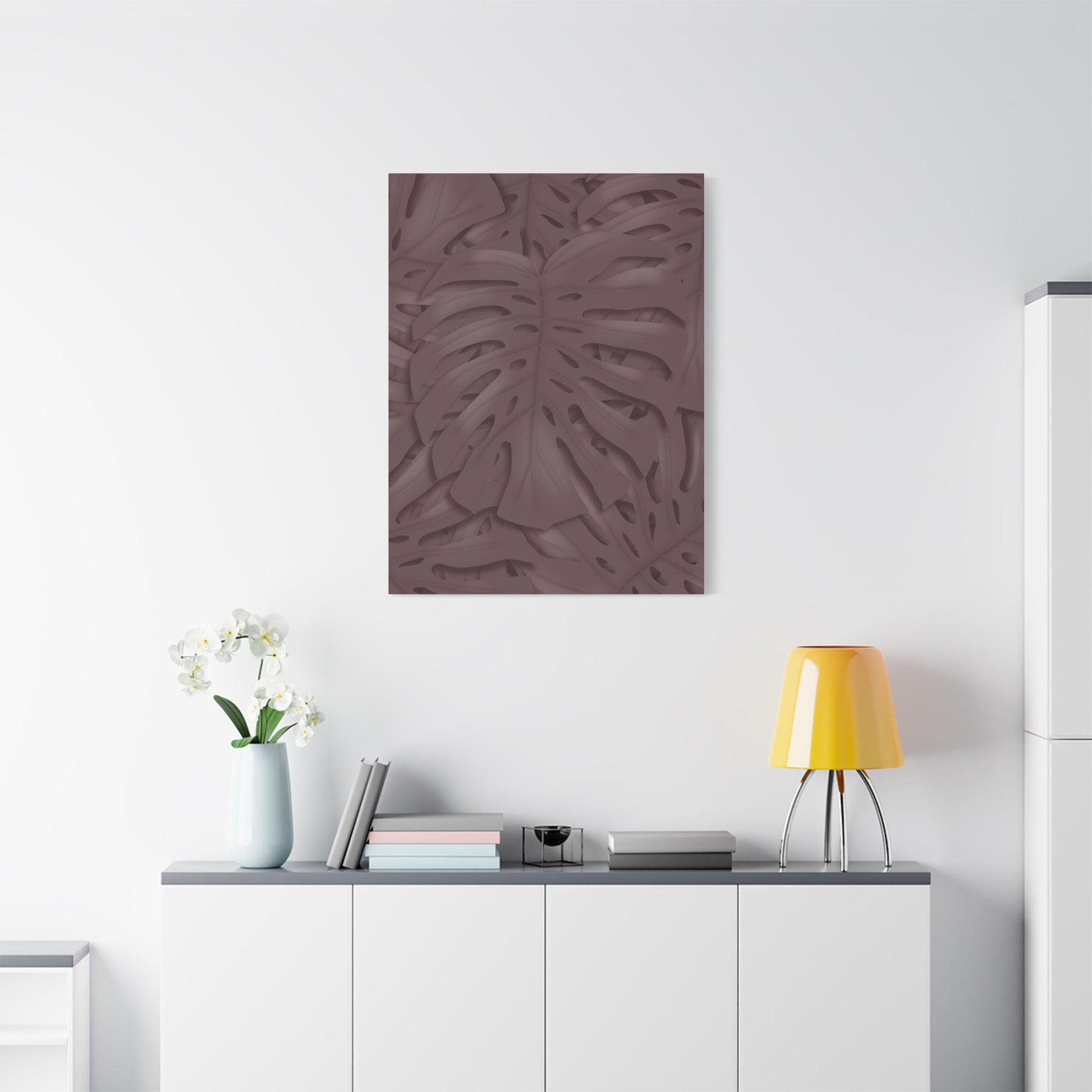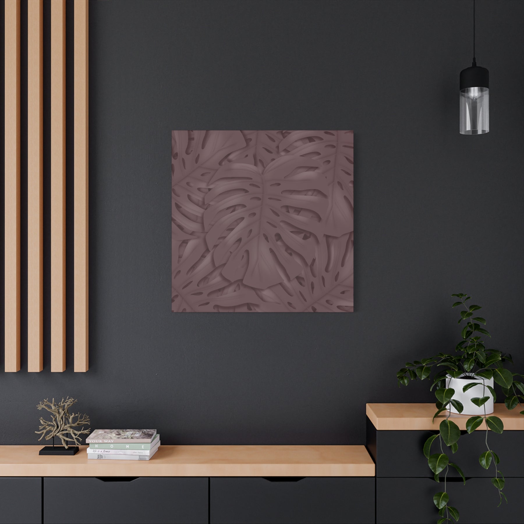 Perfect for spaces that benefit from a warm, natural vibe without clutter. Imagine it above a sofa in a living room, anchoring a minimalist hallway, or adding personality to a modern home office. The Merlot Monstera serves as a calm, sophisticated backdrop that complements wood tones, brass accents, and soft textiles. Its botanical motif also makes it a thoughtful gift for plant lovers and design enthusiasts alike.