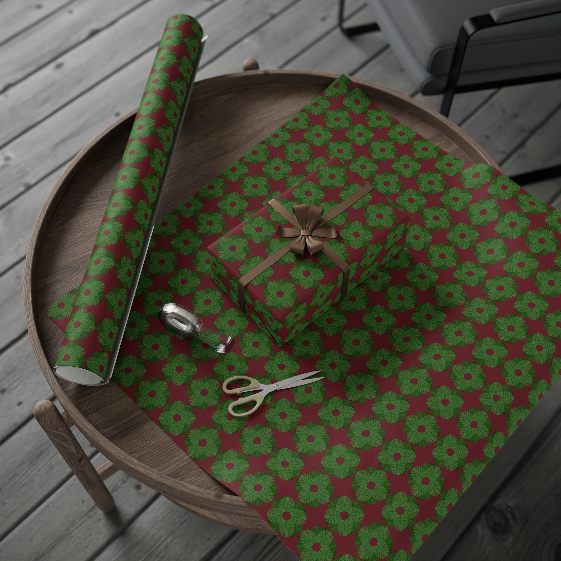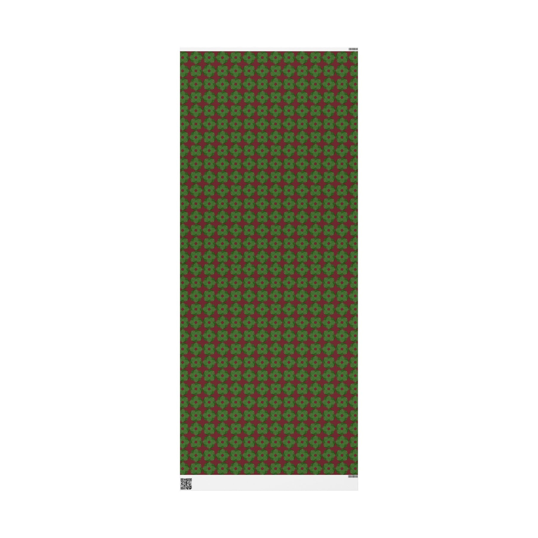 This festive wrapping paper brings a quiet, handcrafted warmth to holiday gift-giving. Deep berry-red background and repeating evergreen monstera wreath motifs in painterly greens create a cozy, nostalgic mood—like a slow afternoon spent trimming the tree and sipping something warm. The design reads as both classic and slightly rustic, so it blends easily with twine, kraft tags, or glossy ribbons. Available in multiple roll lengths and a choice of matte or glossy finish, it’s made on sturdy 90 gsm fine art paper that holds folds and ties cleanly. Small white trim at the top and bottom contains a production bar and QR code—an intentional detail that doesn’t interfere with the pattern. Wrap presents that feel thoughtful, homey, and quietly festive.
