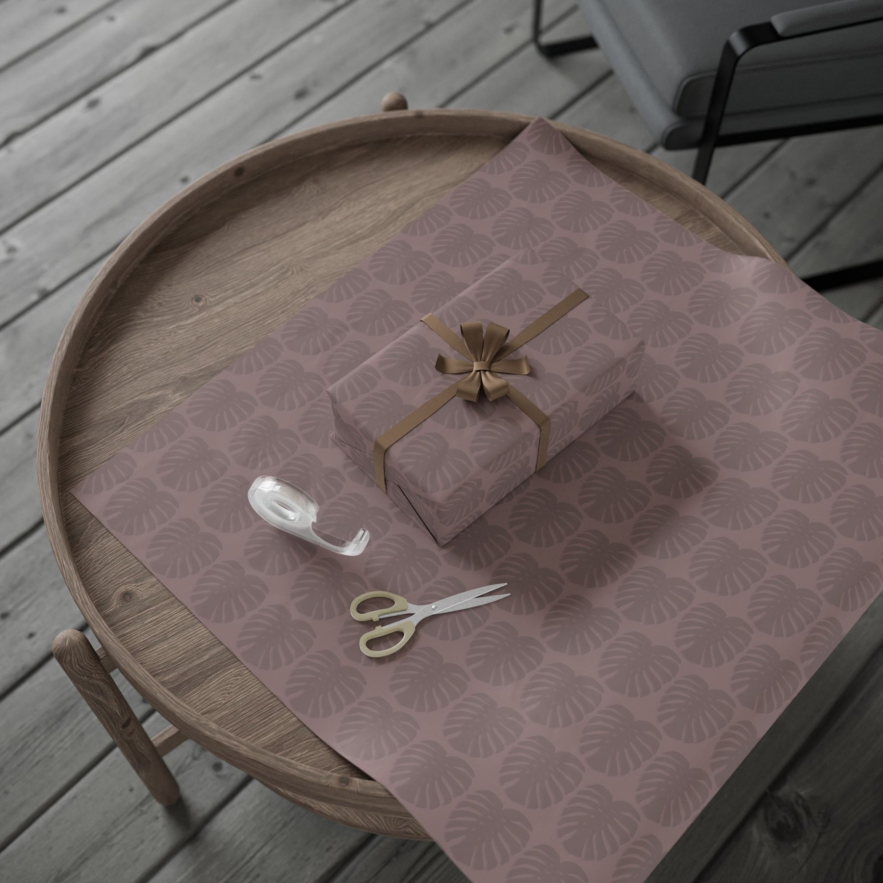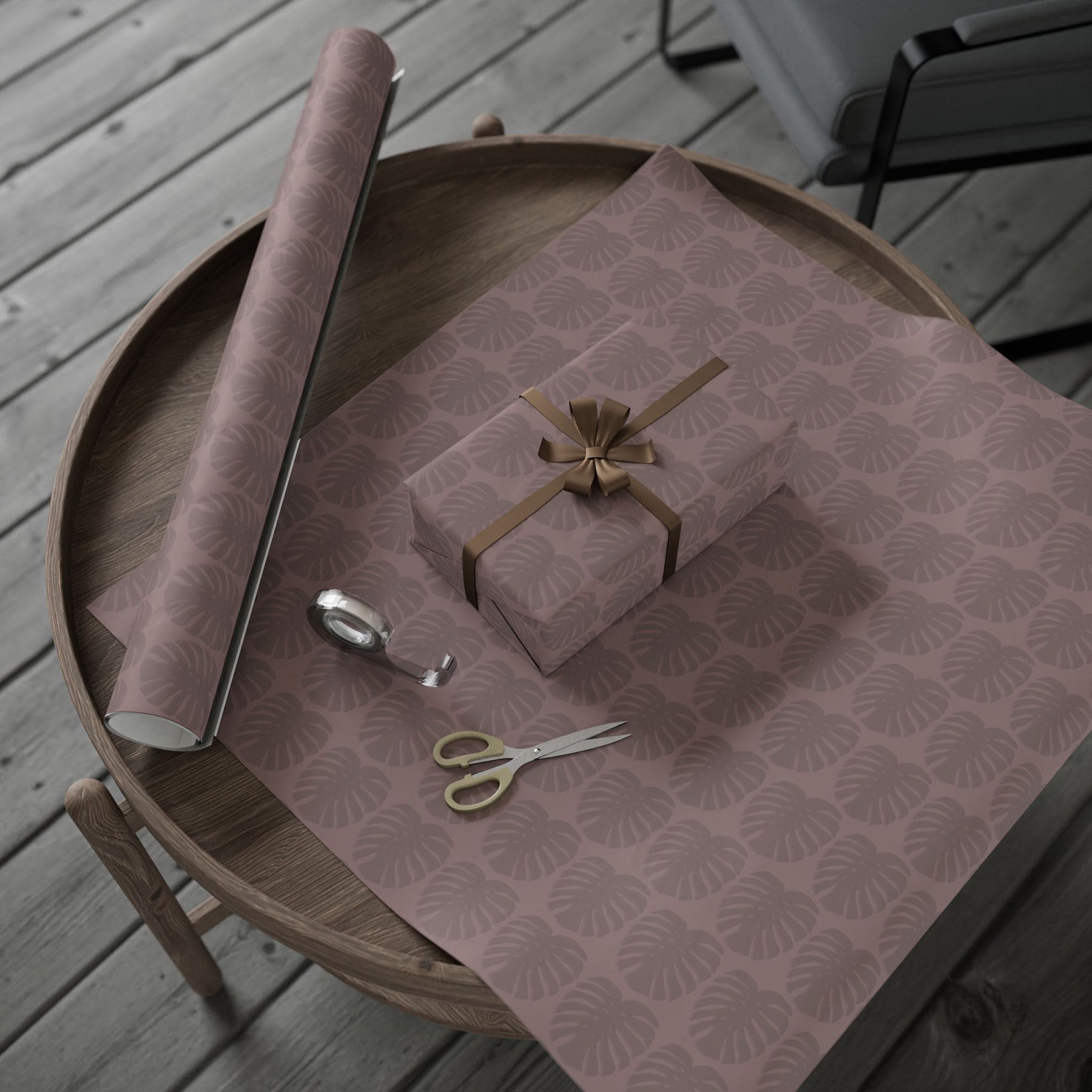 Soft, sculpted leaves drift across a warm mauve background to create a calm, sophisticated wrapping paper that feels both modern and quietly organic. The repeating monstera-inspired motif reads subtle at a distance and reveals delicate veining up close. Use the longer rolls to wrap tall bottles or multiple gifts, or the smaller size for delicate boxes and keepsakes. The muted, earthy tone and artistic pattern suit cozy, slow-living moments—think intimate birthdays, housewarmings, or a weekend of thoughtful exchanges between close friends.