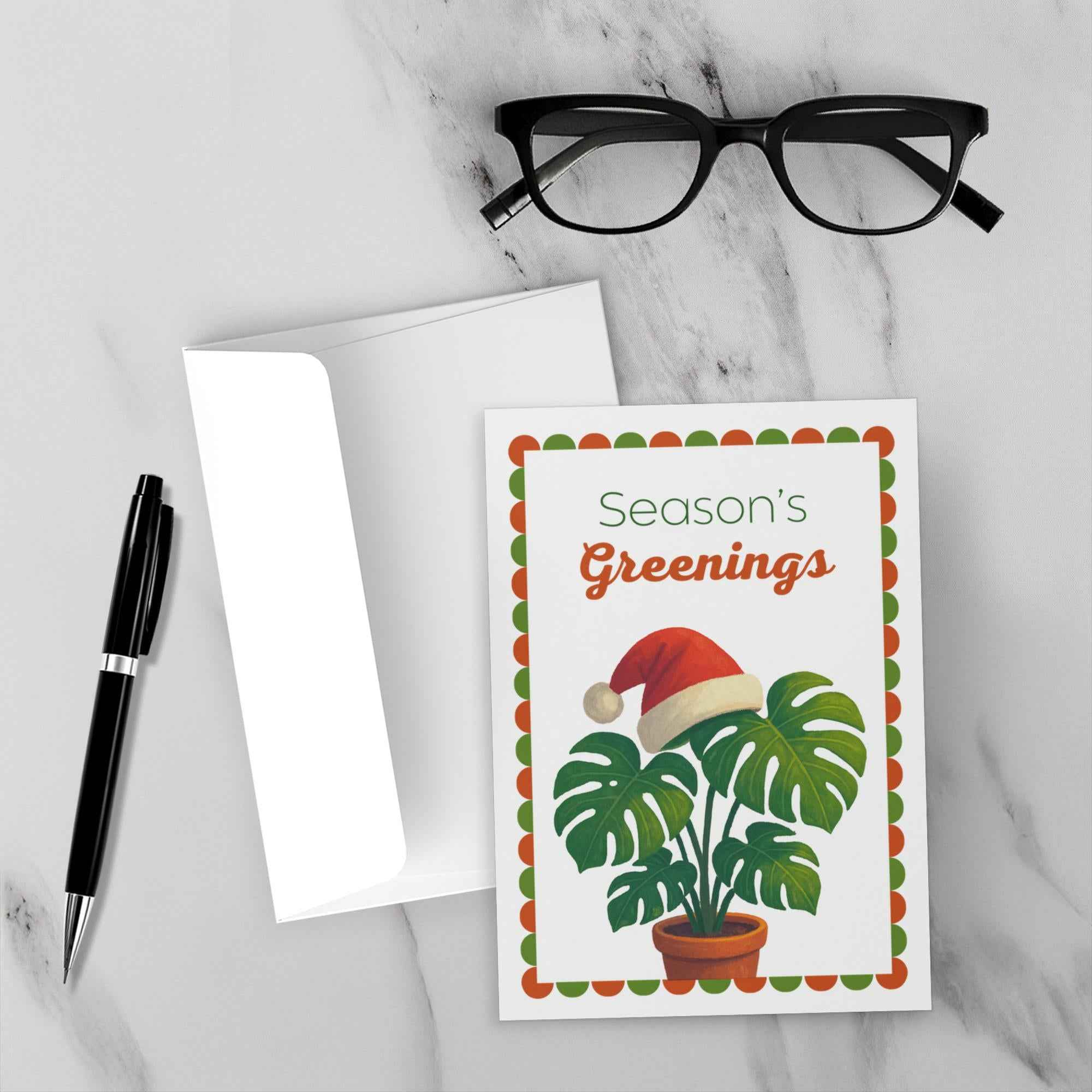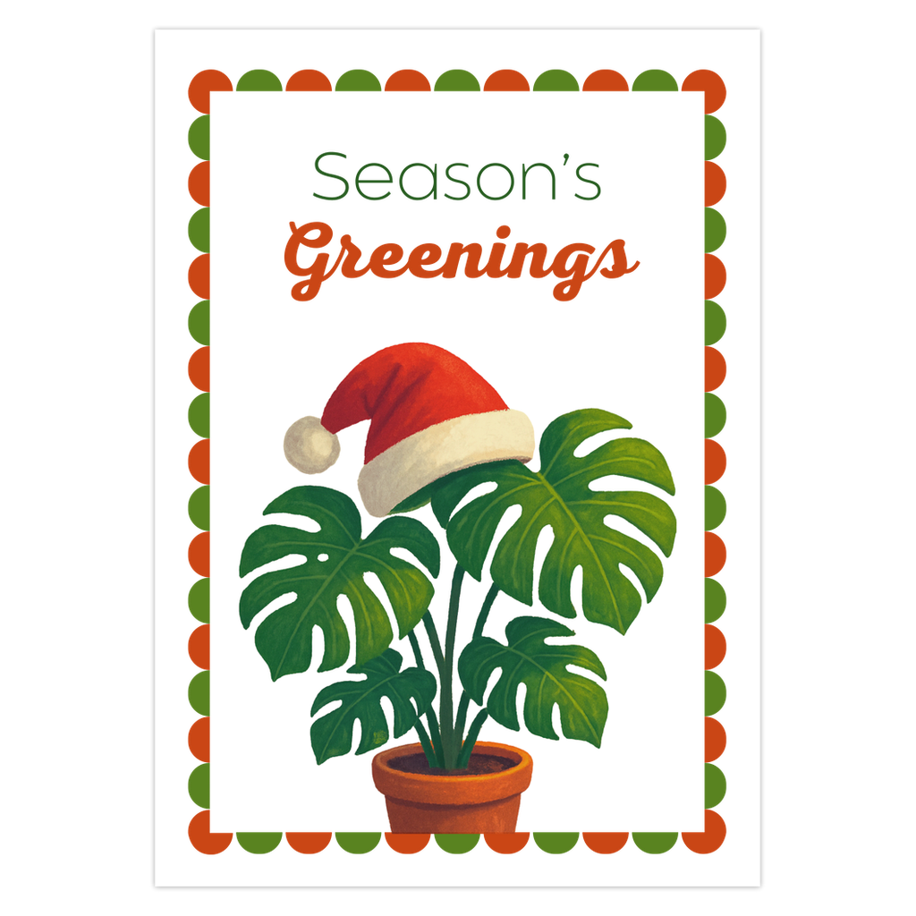 Designed by The Potted Pixel, these seasonal greeting cards combine artistry with practicality. Print clarity and color fidelity have been tested to ensure the Monstera leaf and holiday details pop from the page, so your personal message shines as brightly as the artwork.