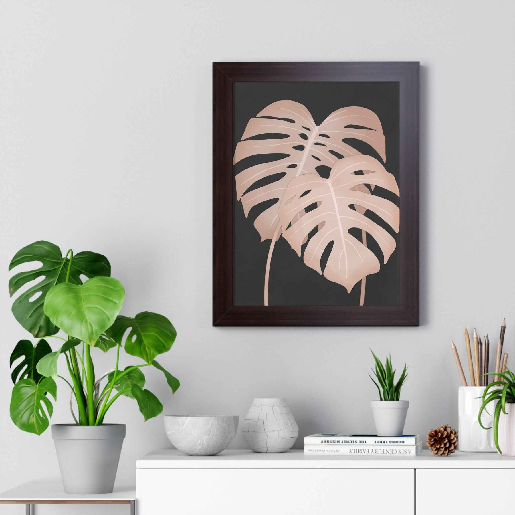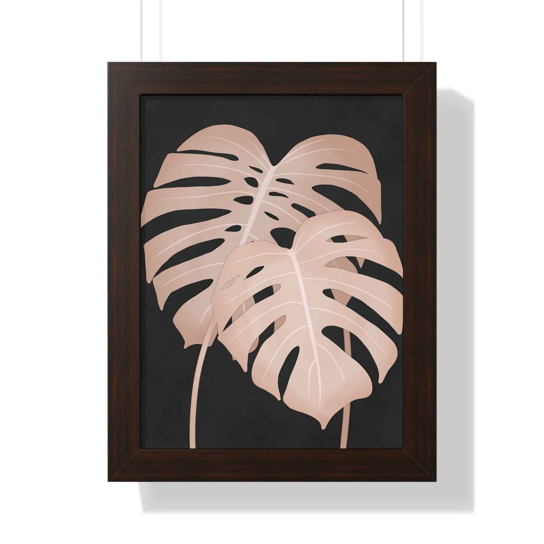 Soft pink Monstera leaves float against a deep, velvety backdrop in a vertical framed poster that brings quiet, modern botanical calm to any room. This is more than wall art — it’s a poised accent that anchors a minimalist vignette, complements greenery, and softly elevates spaces like entryways, small nooks, and gallery walls.