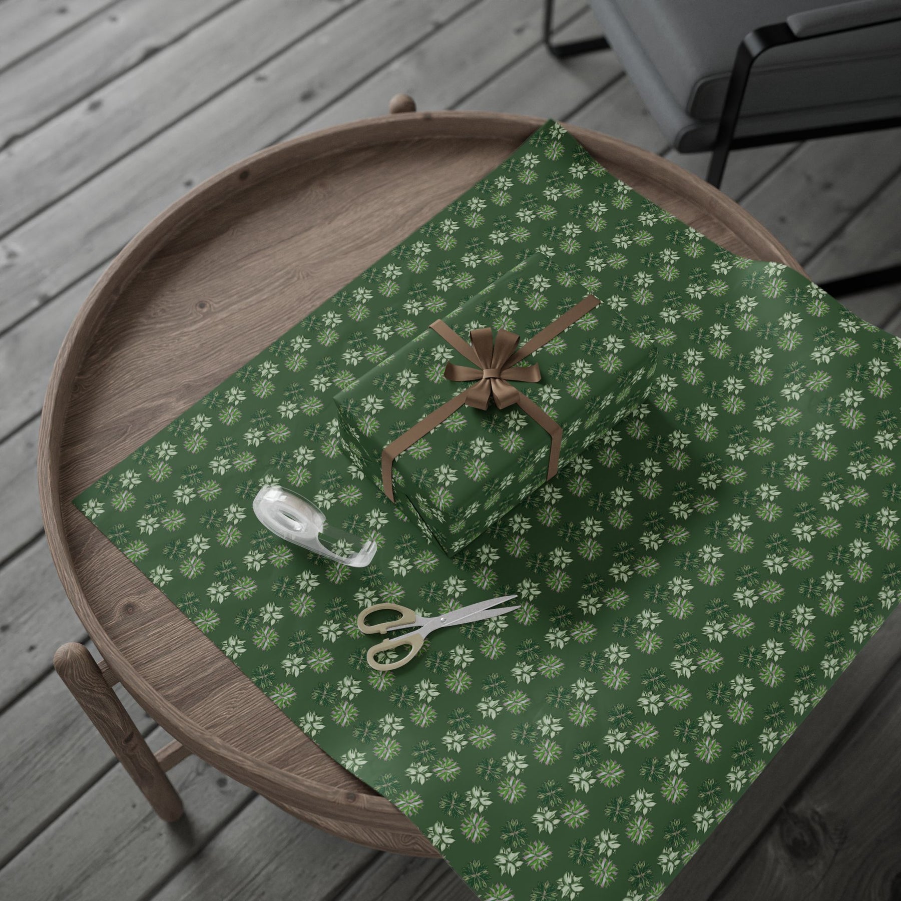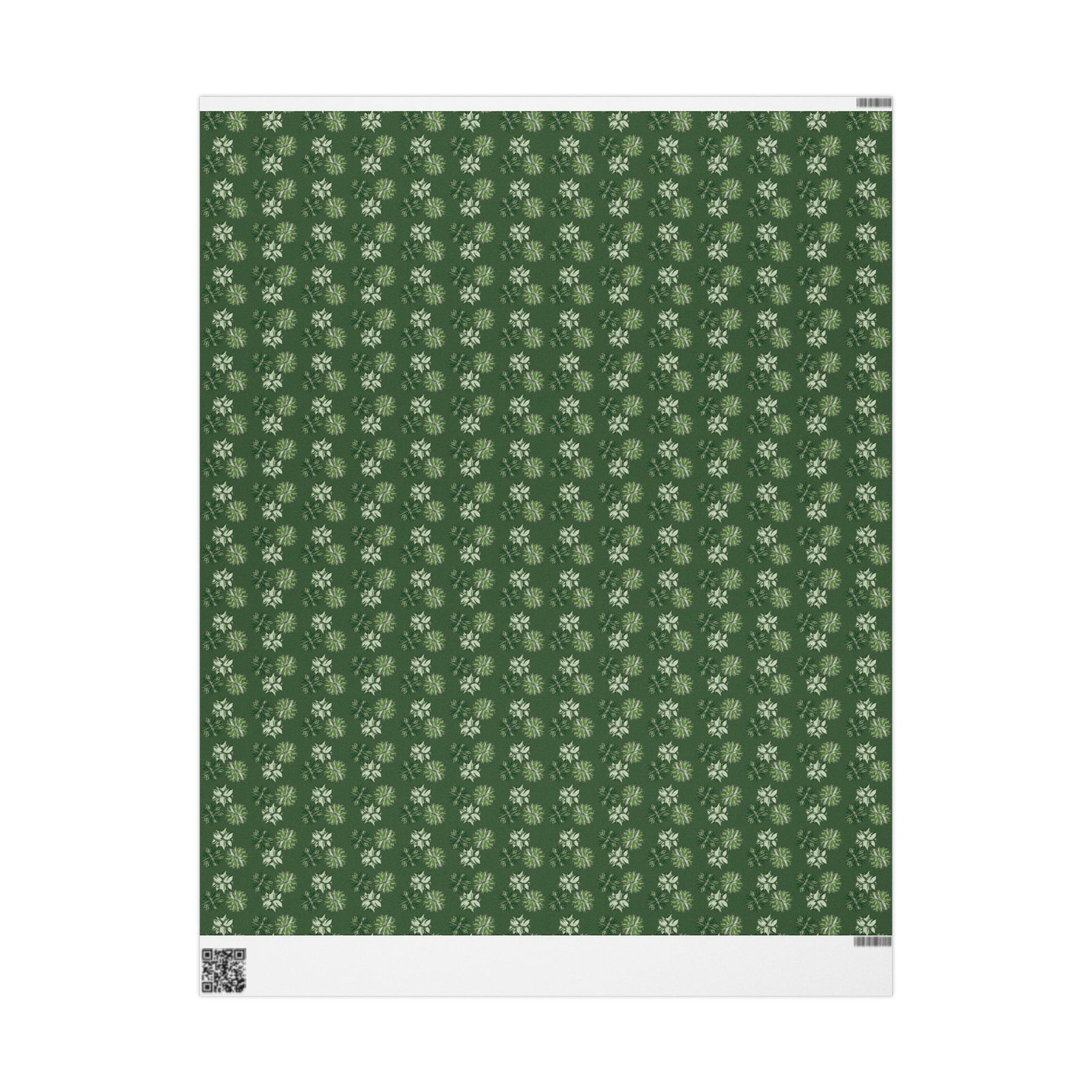 A deep forest-green wrapping paper patterned with delicate, hand-drawn floral clusters. The repeated botanical motif feels both vintage and calm — like a quiet walk through an evergreen garden. The heavy 90gsm fine art paper holds crisp folds and rich color, whether you choose a glossy shine that makes the greens pop or a soft matte for a more refined, tactile finish. Rolls come in three generous lengths to cover small boxes or large parcels. Use it to wrap holiday presents, housewarming gifts, or any moment when you want the unwrapping to feel thoughtful and composed.