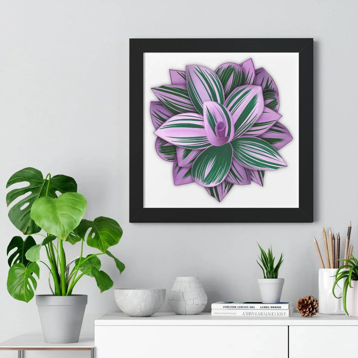 The Tradescantia Nanouk Print blends a bold color palette with a refined presentation, making it an inviting focal point in both minimalist and eclectic interiors. The vivid green, creamy white, and pink tones harmonize with a wide range of furnishings, while the pink-foliage undertone adds a modern twist to classic plant art.