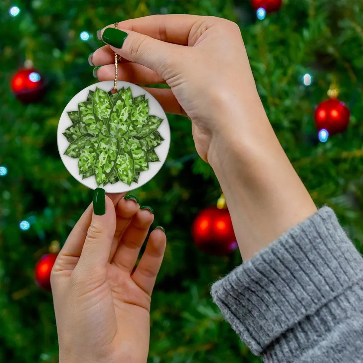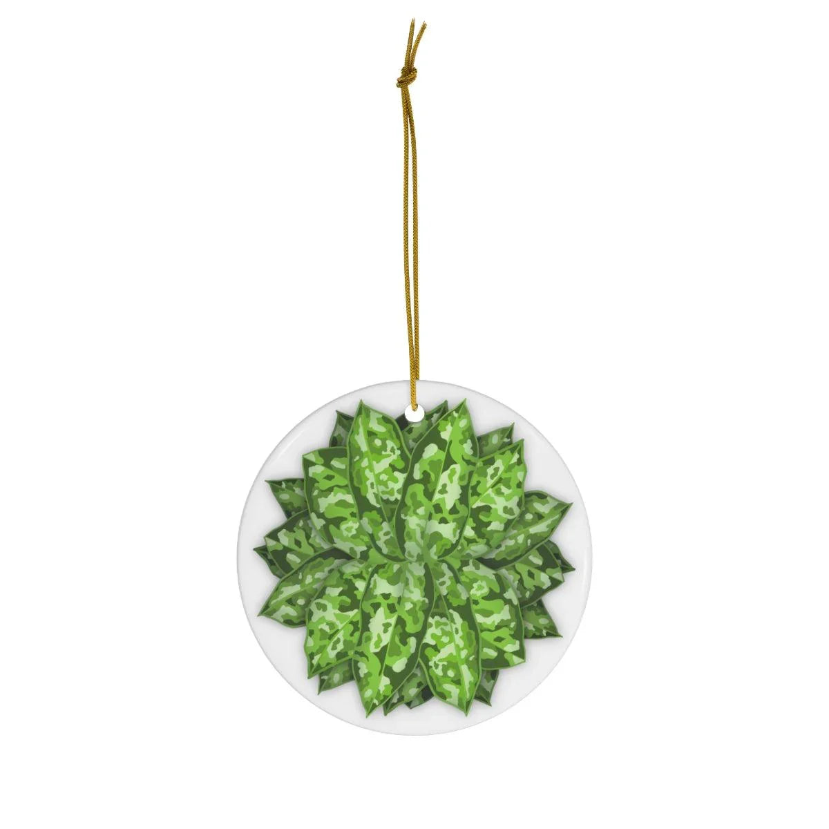 Designed for durability and shine: The ornament is 0.125 inches (3 mm) thick, crafted from durable glossy ceramic that catches the light and resists the rigors of seasonal display. Its hand-drawn camouflage leaf motif mirrors the distinctive tricolor foliage of the Chinese evergreen, offering authentic botanical flair without the maintenance of live plants.