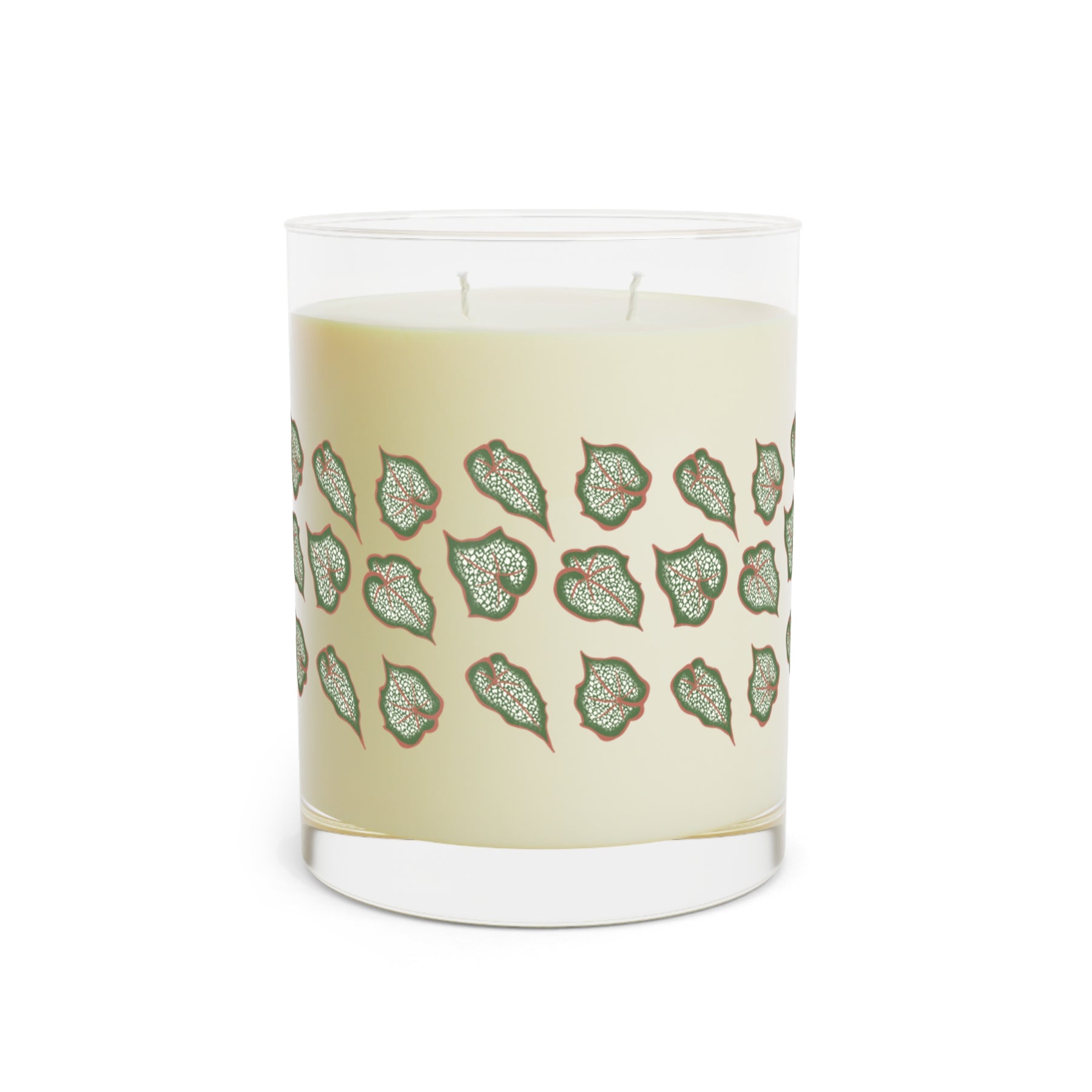 Elevate your everyday rituals with the Begonia Pattern 11oz Scented Candle. Every inch of the clear glass is wrapped in a graceful begonia leaf motif that catches the light as the candle glows, bringing a touch of nature-inspired charm to any room. Two cotton-cored wicks burn evenly, delivering a steady, gentle glow that enhances quiet moments and slow Sundays alike.